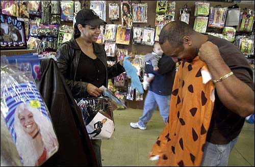 Dawn Martin watches as her husband, Clyde, sizes up a Fred Flintstone costume at Spirit Halloween Superstore in Broadview, Ill. Surveys show that more and more adults are celebrating Halloween with costume sales reaching higher percentages than in years past.