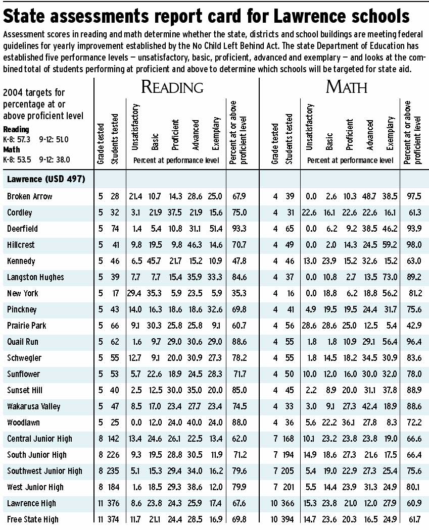 | District officials will report on the state assessments to the Lawrence school board at 7 p.m. Monday at the district office, 110 McDonald Drive. |