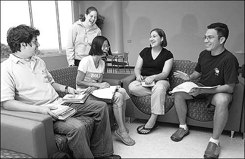 Thematic learning communities peer educators visit at Ellsworth Hall. Sitting from left are Michael Younker, Ellinwood senior; Shin Ying Chu, graduate student from Malaysia; Deana Neunschwander, Overland Park sophomore; and Victor Vaca-Bastumante, Bolivia junior. Beth Kimberly, Fairway senior, is standing. The Thematic Learning Communities program puts first-year Kansas University students with similar academic interests together in core classes and in residence halls.