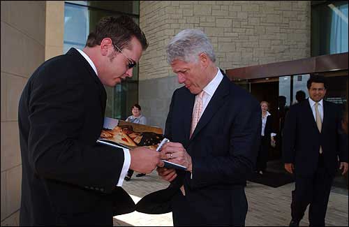 Patrick Smith, left, of Lee's Summit, Mo., brought a copy of Rolling Stone magazine for former President Clinton to sign at the Dole Institute of Politics. Clinton visited the Dole Institute after speaking Friday at Allen Fieldhouse.