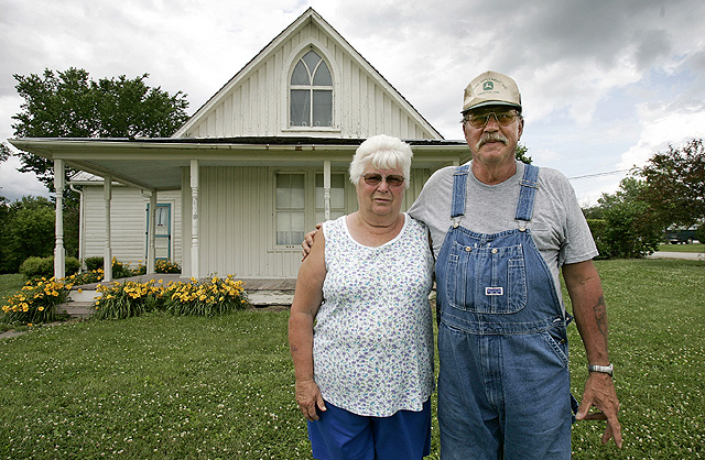 Wayne and Shirley Slycord, of Eldon, Iowa, pose for a photo in front of the house made famous in Grant Wood's painting American