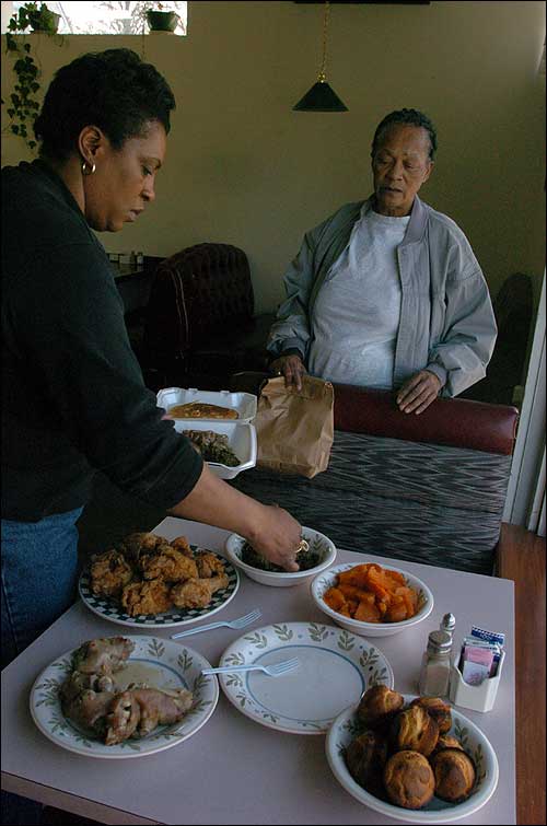 Odessa Shorter is among the Lawrence residents who occasionally indulge in cooking soul food. Shorter cooked fried chicken, corn bread, sweet potatoes, and ham hocks and mustard greens on Friday.