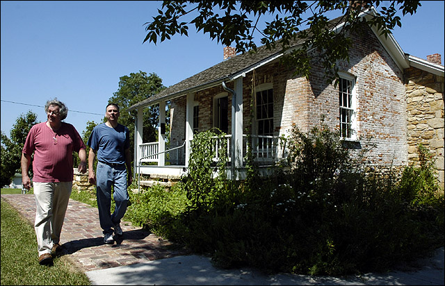 The Murphy-Bromelsick house in Hobbs Park, 10th and Delaware streets, is one of many Bleeding Kansas-era sites in the county. Mark Kaplan, who has directed conservation efforts of the Hobbs Park Memorial, left, and Dave Evans, a volunteer researcher, right, were pictured outside the house recently. The U.S. Senate on Tuesday approved legislation that includes 26 Kansas counties in a National Heritage Area designation.