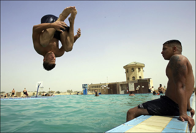 U.S. Army Pfc. Stephen Thomas of Gainesville, Fla., flips into the swimming pool at Camp Victory in Baghdad, Iraq. The dusty complex, which includes an Americanized dining hall and electronics store, has palaces once used by Saddam Hussein.