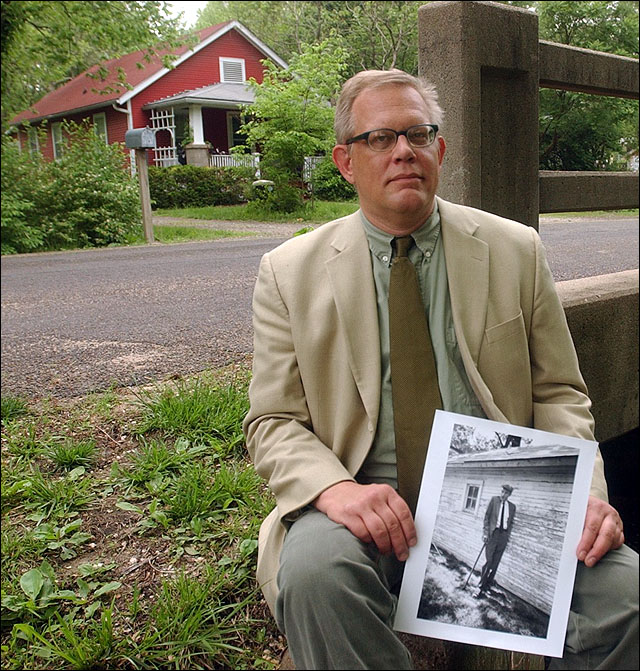 James Grauerholz, a longtime companion and executor of famed author William S. Burroughs holds a photo of the late Burrough's in front of Burrough's home at 1927 Learnard.