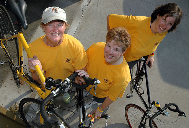 Cyclists, from left, Susie Schwartz, of Wichita, Carolyn Brock, of Kansas City, Mo., and Susan Smith, of Lawrence, will be among the riders in the Border Raiders ride starting today in Lawrence. The 400-mile ride through Civil War-era history will take riders through parts of Kansas, Nebraska, Iowa and Missouri.