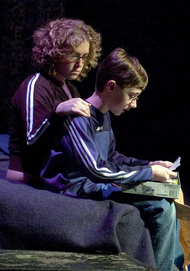 Josh's mom, played by Rachael Perry, comforts 8-year-old Josh, played by Kris Hilding, as he reads a letter from his father, who is overseas serving in the military. The play, which is the first co-produced by English Alternative Theatre and University Theatre, opened Monday at the William Inge Memorial Theatre.