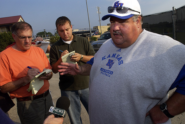 Kansas University football coach Mark Mangino, right, speaks with reporters after practice. Mangino announced Wednesday that freshman quarterback Kerry Meier would return to practice Monday after he successfully underwent a procedure to fix a heart ailment that was detected in preseason screening.