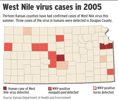 A day after Douglas County’s second and third human cases in 2005 were announced, Townsend Peterson said state procedures made it impossible to know if the Lawrence area was particularly vulnerable to the virus. No other county has seen more than one case this year.