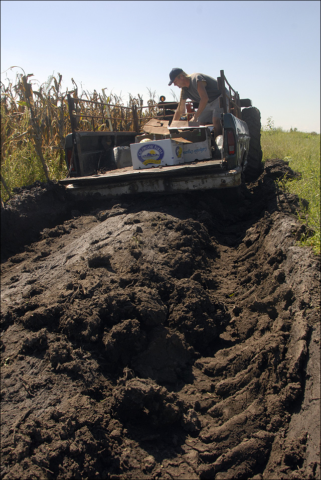 Kevin Irick, who lives northeast of Lawrence, tries to figure out how to get a load of melons out of a field of mud. Recent heavy rains on the heels of a dry spell have played havoc with Irick's crops.