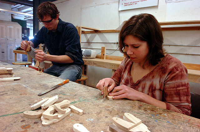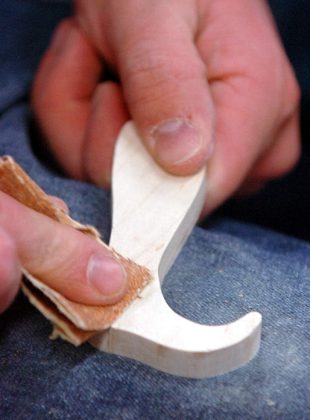 A leg of one of the dolls gets some finish sanding. Matt Burke, assistant professor of sculpture and adviser to the Ministry of Sculpture, designed the wooden toys to be similar to dolls sold around Fat Tuesday, with hats and pointed feet to mimic special shoes.