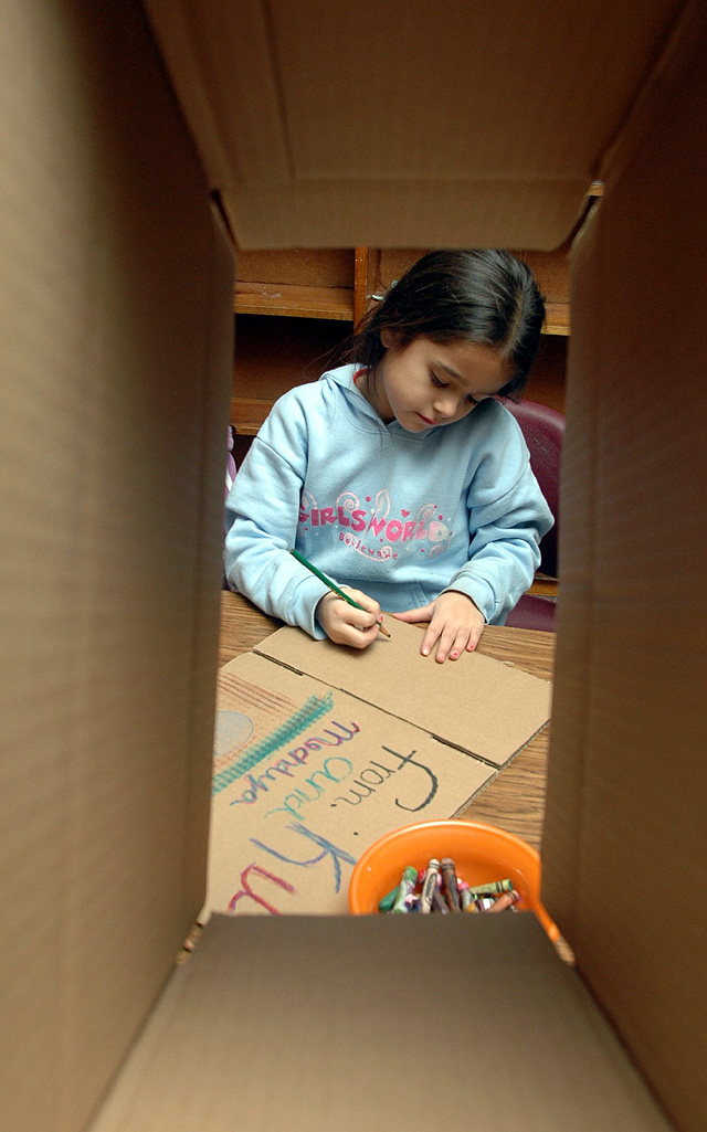 Meshayla Garcia 7, colors a box that will hold toys to be shipped to child victims of Hurricane Katrina. Woodlawn School students assisted with the project started by Kansas University's Ministry of Sculpture.