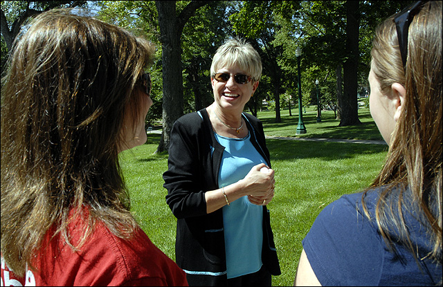 Pat Long, Baker University's new president, center, greets prospective students on the Baker campus, including Whitney Kamish, Glenwood, Iowa, left, and Katie Bornholdt, Inman. Long has been on campus for three weeks preparing for her first year at Baker. Long replaces Daniel Lambert, who retired.