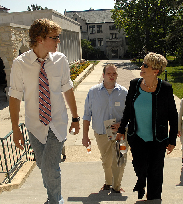 From left Wes Mickel, a Baker University junior, working on a summer internship in marketing, Patrick Lattin, the editor of the Baker Orange student newspaper and Dr. Pat Long, Baker University's new president take a tour of the campus. Long has been on campus for three weeks preparing for her first year at Baker. Long replaces Dr. Dan Lamber who retired.