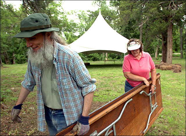 Kerry Altenbernd, left, volunteer coordinator for Black Jack Battlefield Trust, and Diane Niehoff, member of the BJBT board of trustees, move tables away from the entertainment tent. Altenbernd and Niehoff prepared all day Thursday for the events of the sesquicentennial commemoration of Black Jack Battlefield, taking placing today and tomorrow at the historical site near Baldwin City.