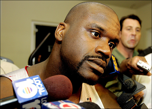 Miami Heat center Shaquille O'Neal takes questions from reporters following a practice on Tuesday in Miami. The Heat will meet the Dallas Mavericks on Thursday in Game One of the NBA Finals.