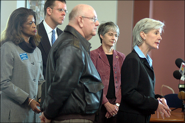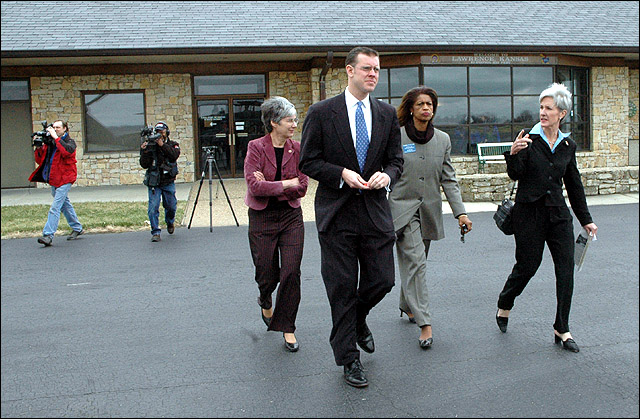From left Rep. Barbara Ballard, Paul Davis, KU Chancellor Robert Hemenway, Sen. Marci Francisco and Gov. Kathleen Sebelius report on their fly-over of the Lawrence area to assess the damage from Sunday's storm. The Gov. made the trip Monday.