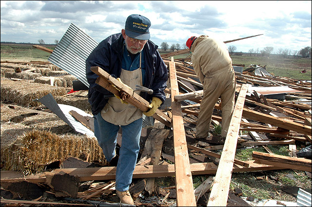 And Pendleton’s Country Market, 1445 E. 1850 Road, found itself flooded with as many as 40 helpers – including some from Kansas City – as the owners tried to clean up the mess left behind by two destroyed silos, one flattened barn and a multitude of other damage.