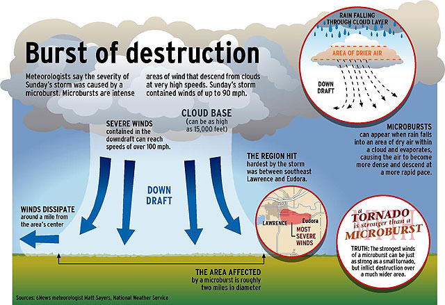 And, he said, a strong microburst – like the one that hit Lawrence Sunday – can be more damaging. The winds can be equally strong in both events, but a tornado typically leaves a narrow, if intense, path of destruction.