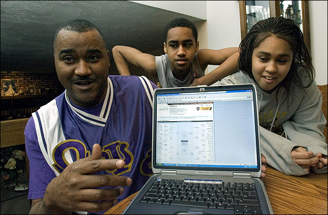 Russell Pleasant, 46, of Bellevue, Neb., left, one of four out of 3 million contest entrants to pick all the teams in this year's Final Four, shows his winning bracket on a laptop computer with his son Russell Jr., 14, and daughter Ashley, 15, in their Bellevue, Neb., home, Sunday, March 27, 2006. A lifelong sports fan who loves Nebraska football and has always rooted for the