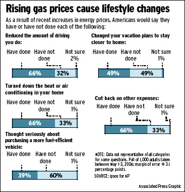 With gasoline prices topping $3 per gallon for regular unleaded in many areas, people say they are driving less, cutting short vacations and curtailing their use of heating and air conditioning.