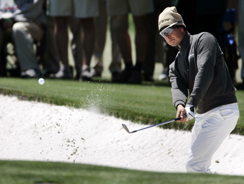 Henrik Stenson blasts from a bunker on the second hole, wearing a stocking cap and long sleeves. A noon temperature of 43 degrees and wind gusting to 23 mph had players scrambling for warm clothing Saturday in Augusta, Ga.