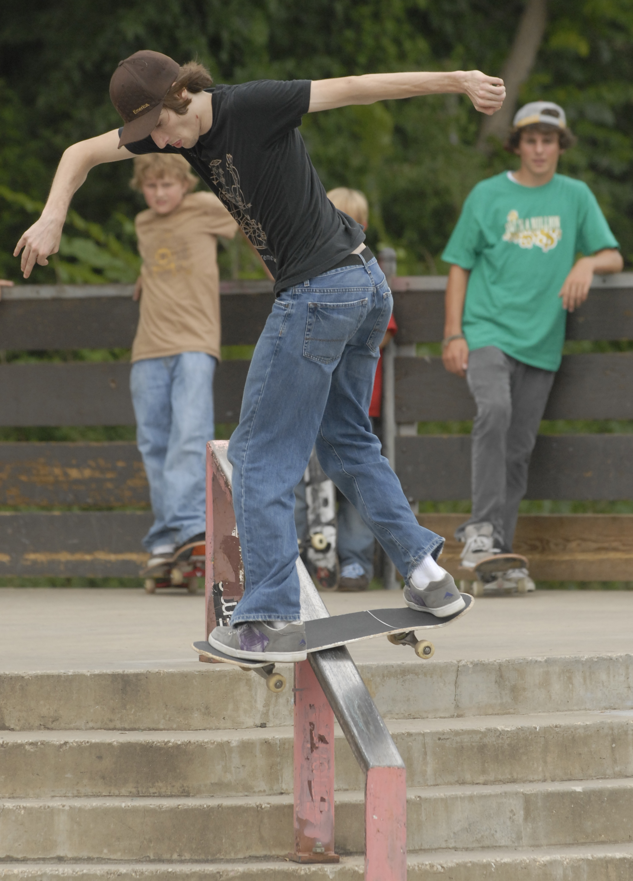 Faron Cotten slides a backside boardslide down the handrail at Centennial Park. After four years of pushing to expand the city's skate park, local skaters will have to continue to wait as city officials put the skatepark addition on hold.