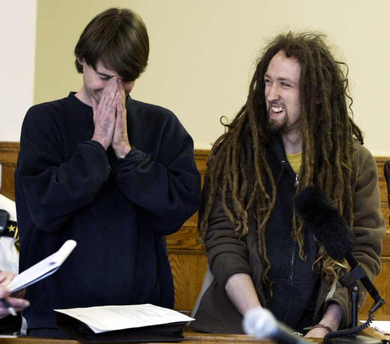 Sean Stevens, 28, left, and Peter Berdovsky, 27, react during their arraignment Thursday in Charlestown District Court in Boston as they plead not guilty to placing a hoax device and to disorderly conduct. The pair allegedly placed electronic advertising devices around the city, an act that stirred fears of terrorism and shut down parts of Boston on Wednesday.