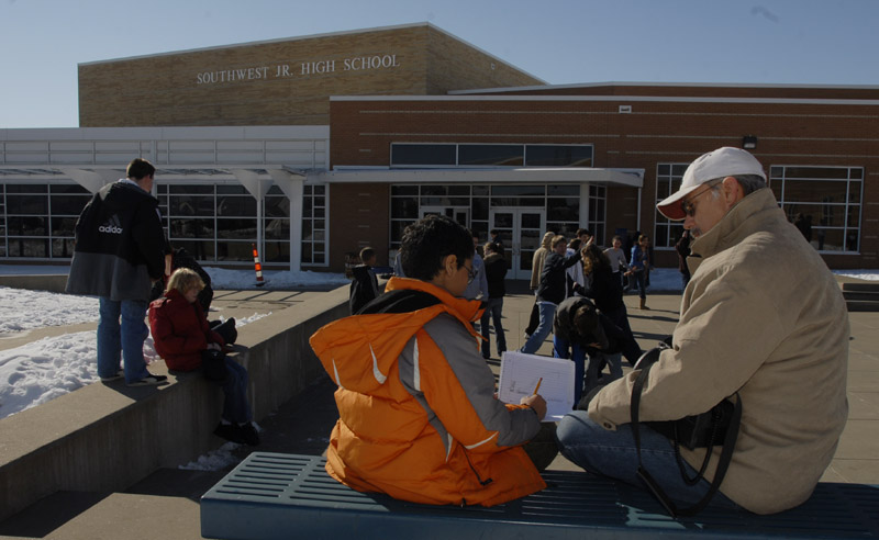 Southwest Junior High student Sudhanshu Manda, 12, left, visits with lab supervisor David Frye recently during recess. The school is planning to install solar panels as part of a national enterprise by Solar 4R Schools.