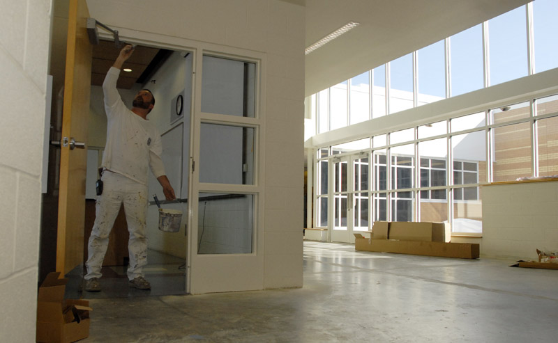 Randy Remer, a painter for A.T. Switzer Co. in Kansas City, Mo., works on the new addition at Southwest Junior High Schol. A planned solar collector may be installed in the area to the right, but the final placement for the solar array has to be designed by an engineering staff.