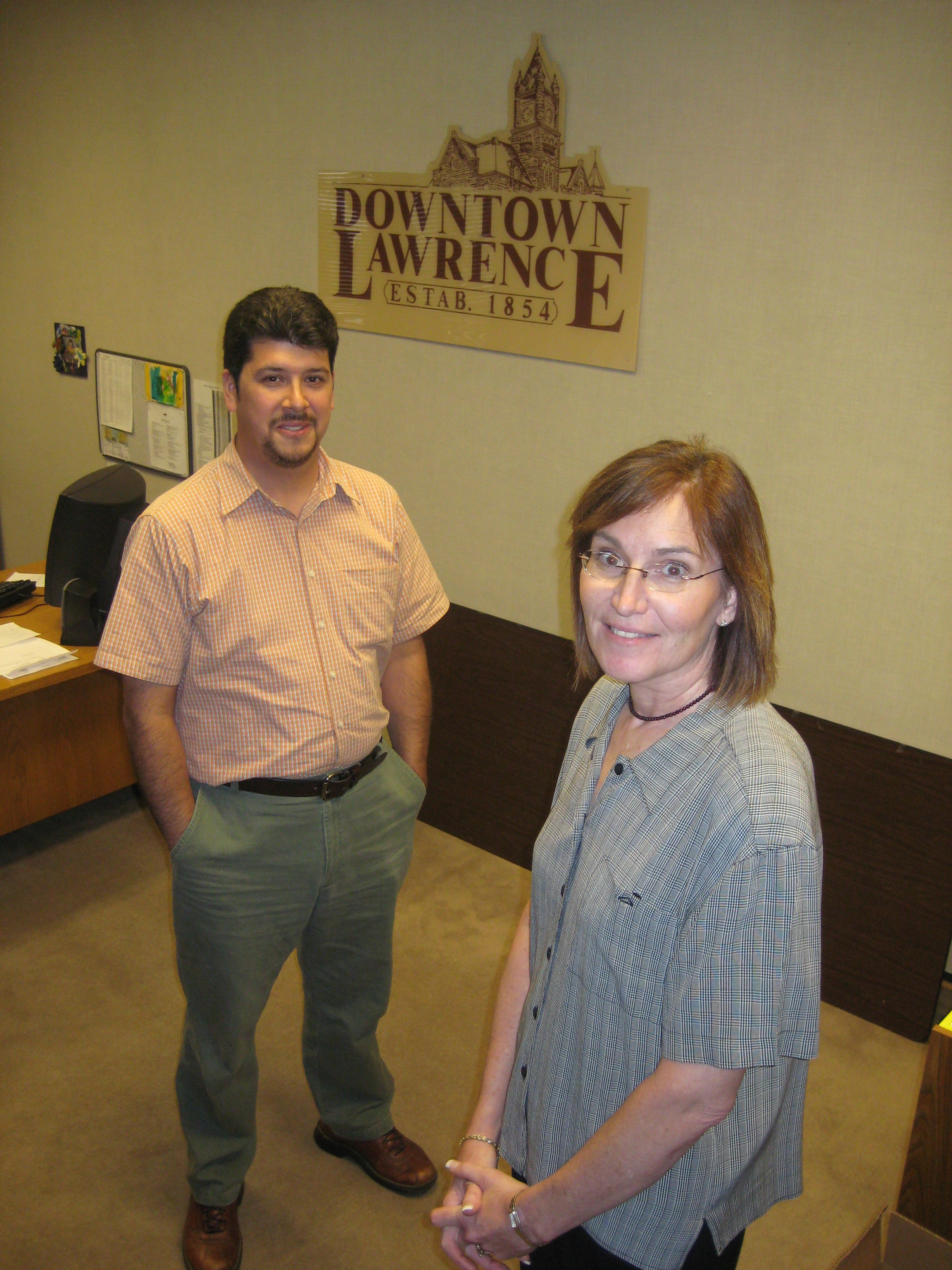 Rick Marquez will turn over his job as director of Downtown Lawrence Inc. to Jane Pennington next month. Pennington now is development director for the Lawrence Community Theatre. They were in Downtown Lawrence Inc.'s office in the U.S. Bank Tower, 900 Mass., on Thursday.