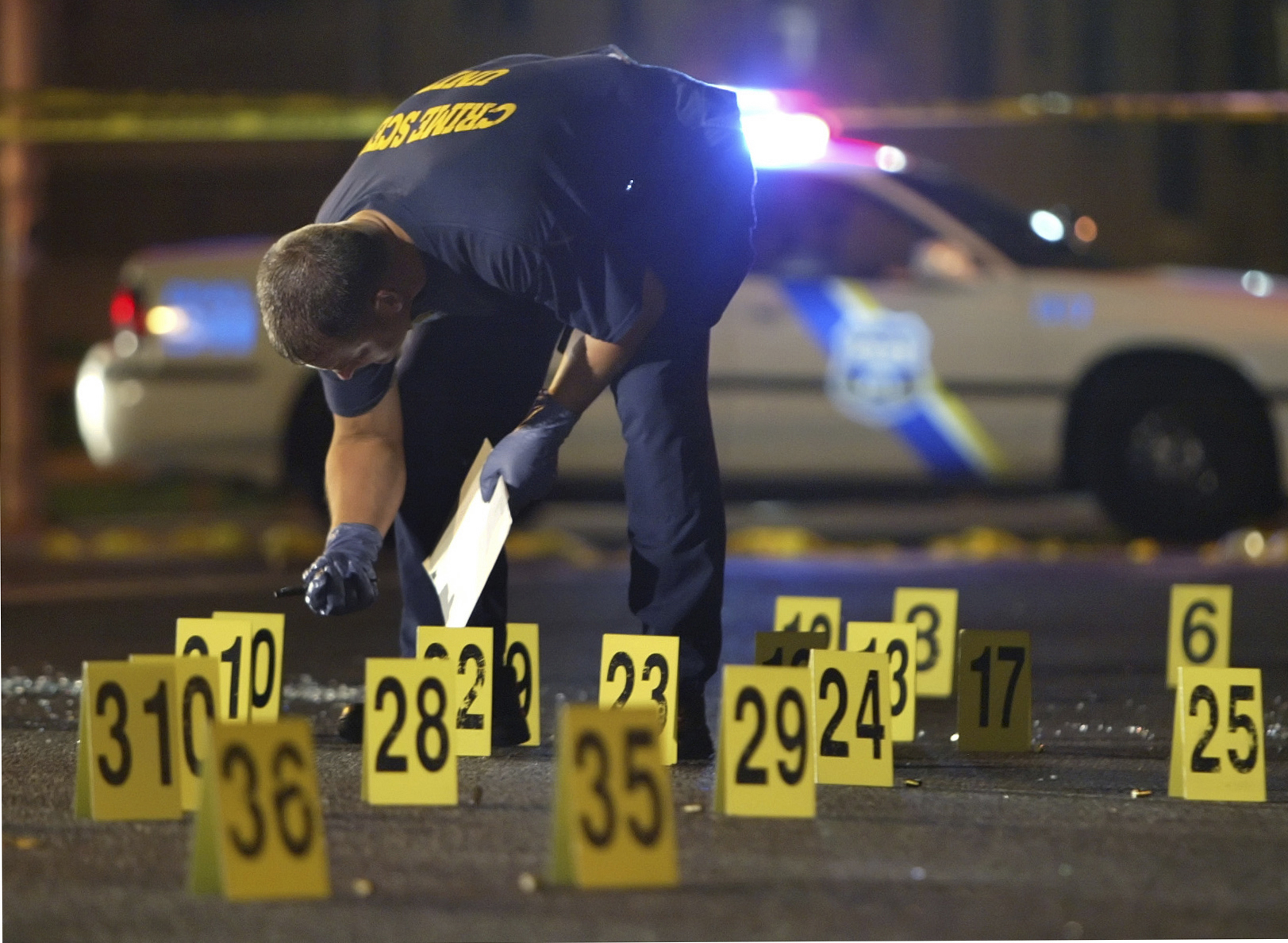 A Police officer investigates a double homicide Sunday in the Overbrook section of Philadelphia. Baltimore, Philadelphia and other cities along the East Coast are seeing a surge in killings, say criminal justice experts.