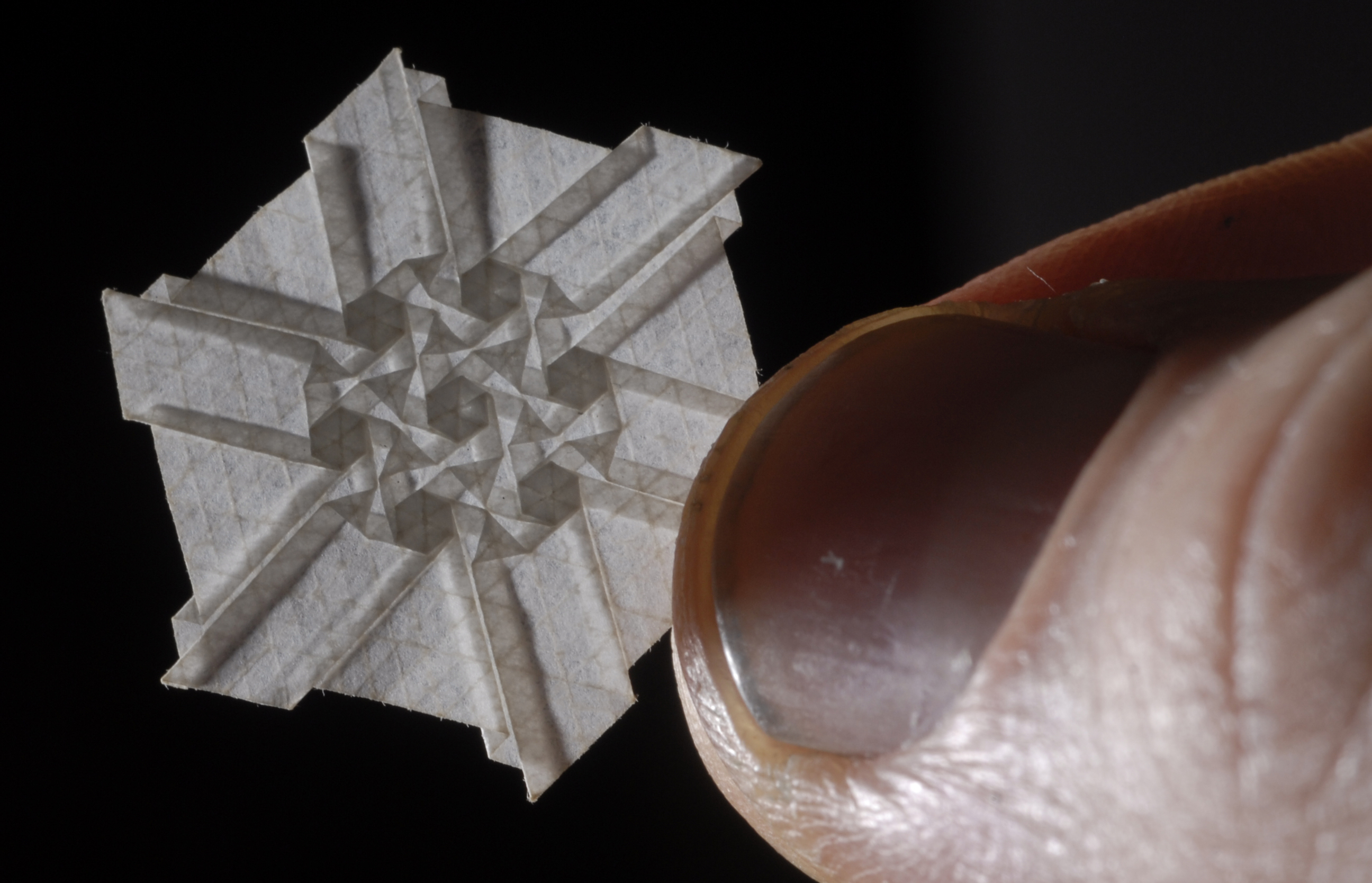 Lawrence artist Joel Cooper holds one of his miniature origami pieces in his fingers.