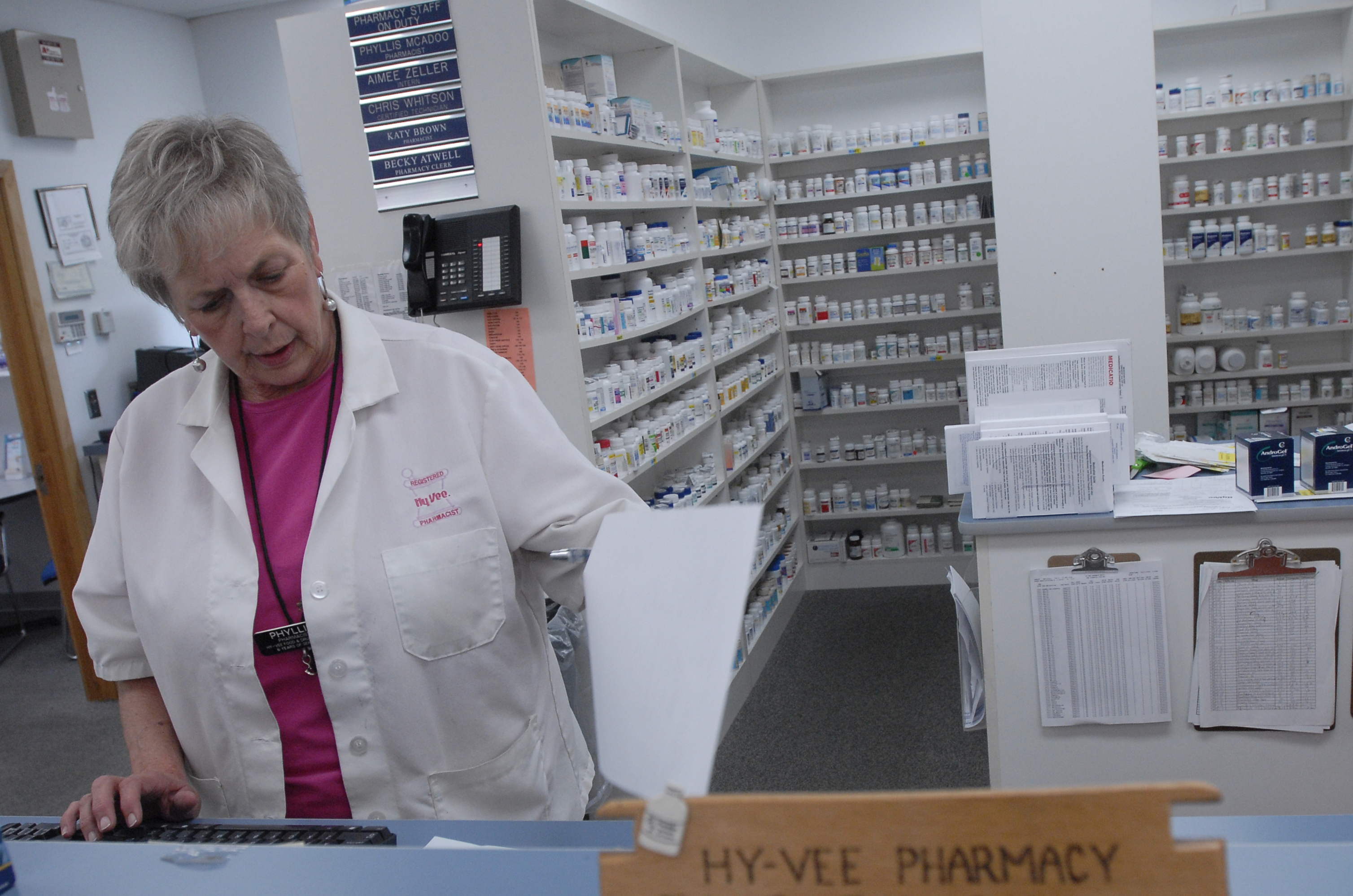 Phyllis McAdoo, 66, works beyond retirement age because she enjoys her job. She’s a pharmacist at the Clinton Parkway Hy-Vee Food & Drug Store.