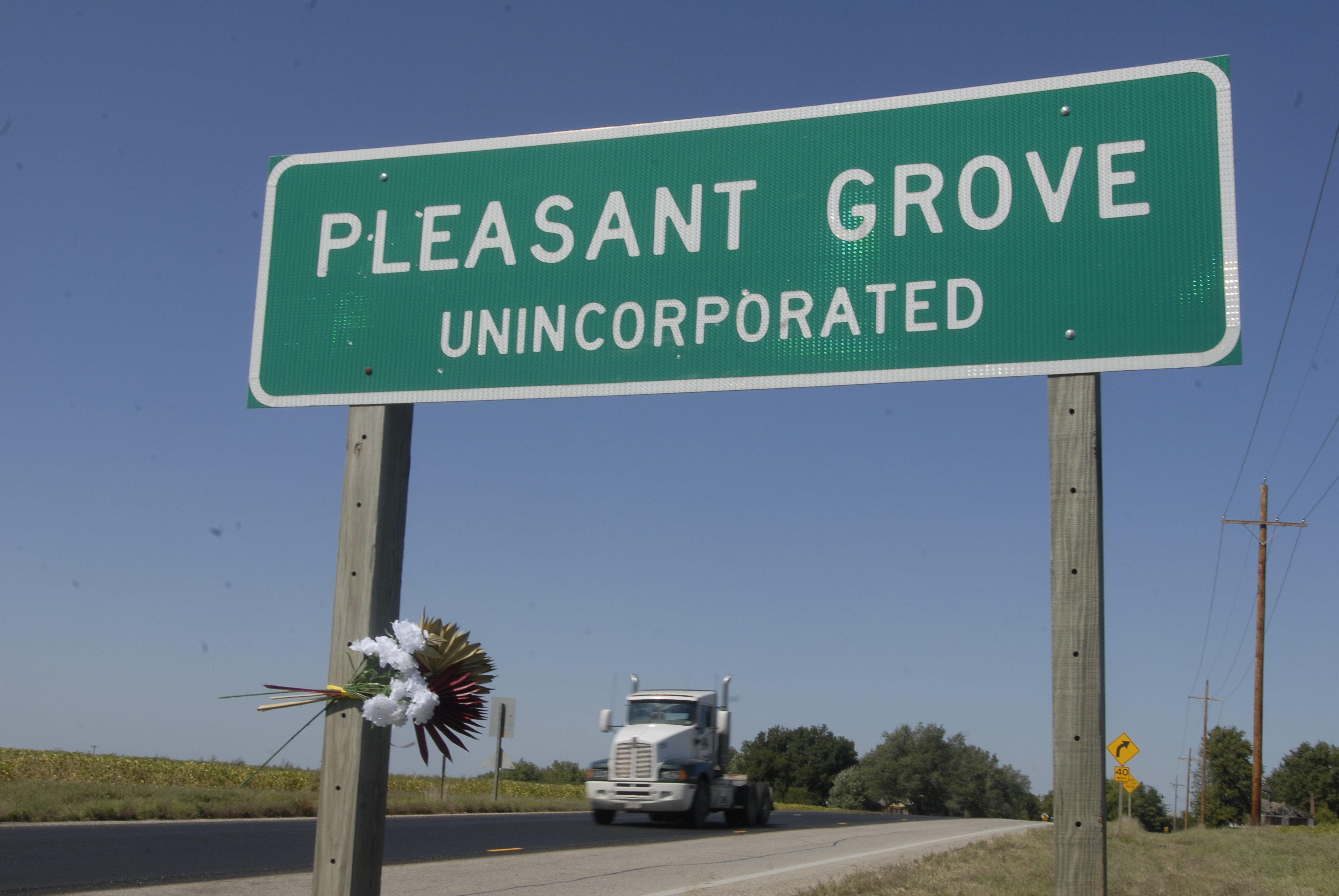 A small bouquet of flowers hangs form the road sign at Pleasant Grove, where two workers were killed Tuesday. Ramona Morgan and her, daughter, Sabrina Morgan, are suspects in the deaths.