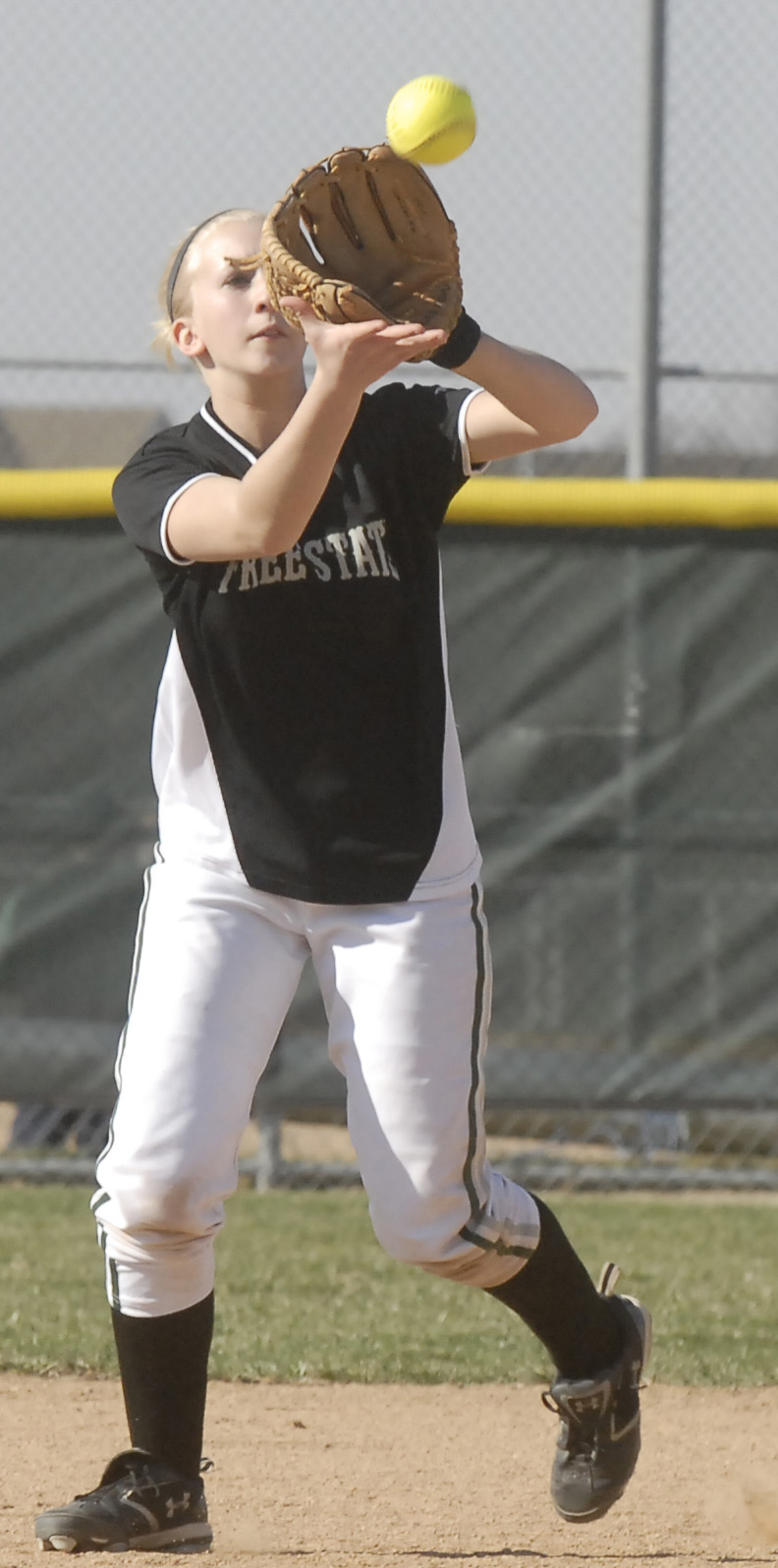 Free state's Ali Ice pulls down a fly ball. FSHS swept Shawnee Mission East, 3-1 and 8-0, Wednesday at Free State.