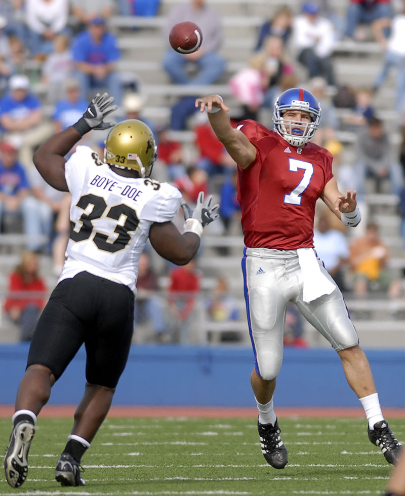Kansas quarterback Adam Barmann heaves a pass over Colorado's Walter Boye-Doe at Memorial Stadium in this Oct. 28, 2006, file photo. Barmann now works with the quarterbacks at Free State High.