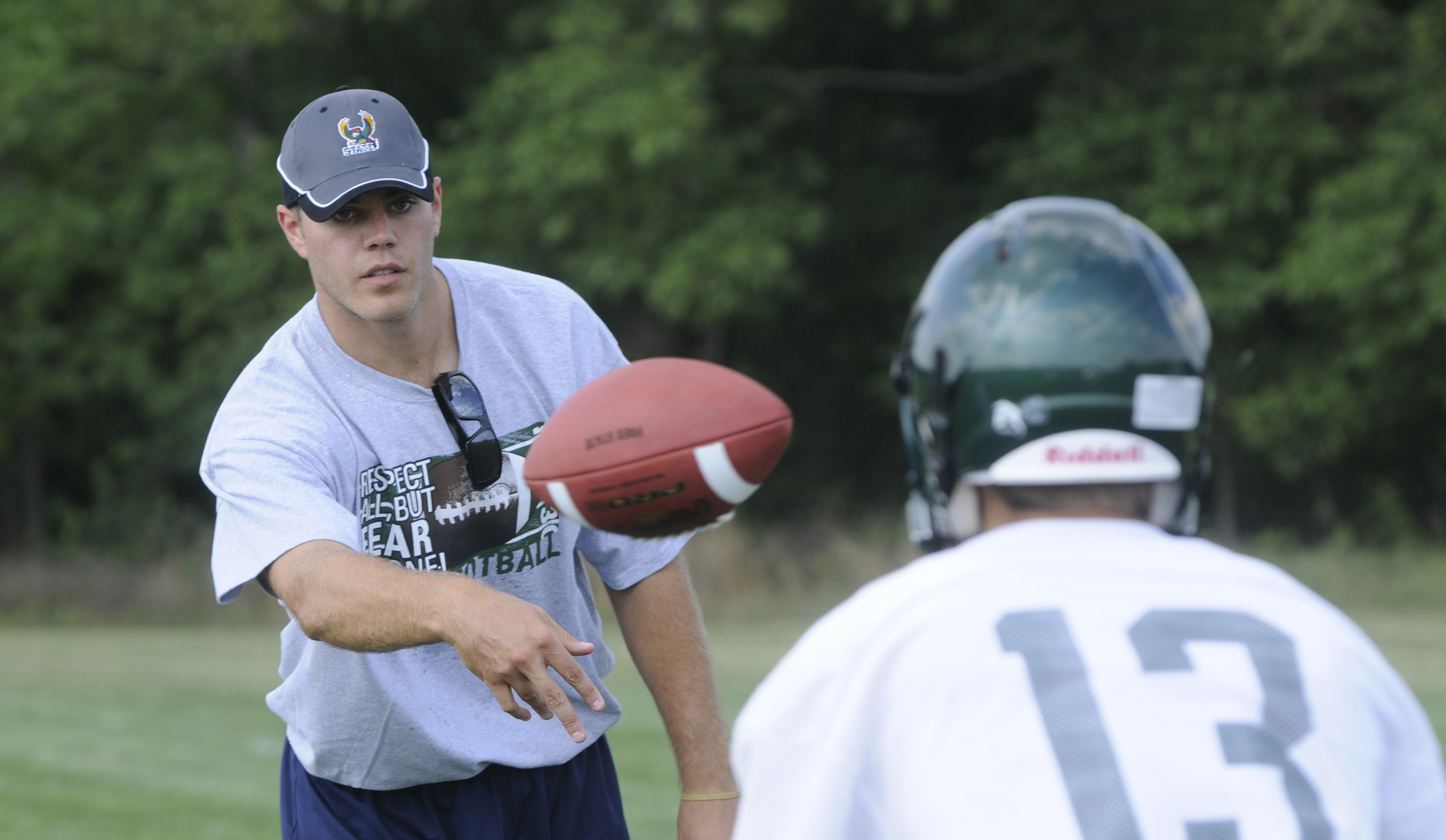 Free State assistant coach Adam Barmann, left, works with a player during Monday's practice. Barmann was a quarterback at KU from 2003 to 2006.