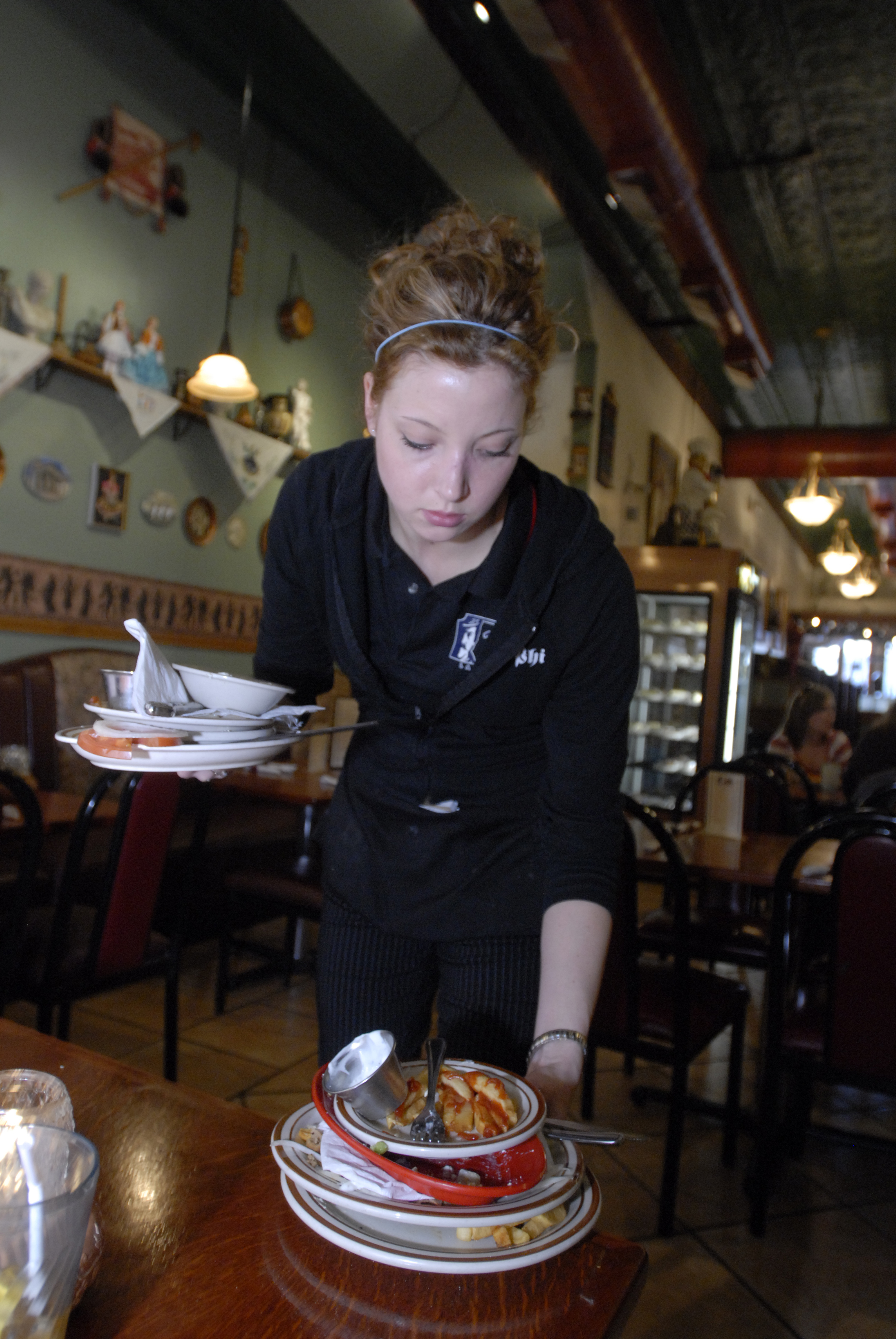 Laura Baker, a waitress at the Mad Greek, cleans a dirty table during her afternoon shift Monday at the downtown Lawrence restaurant. Baker earns minimum wage plus tips as a waitress. At .65 per hour, Kansas' state minimum wage is the lowest in the nation and hasn't increased in 20 years.