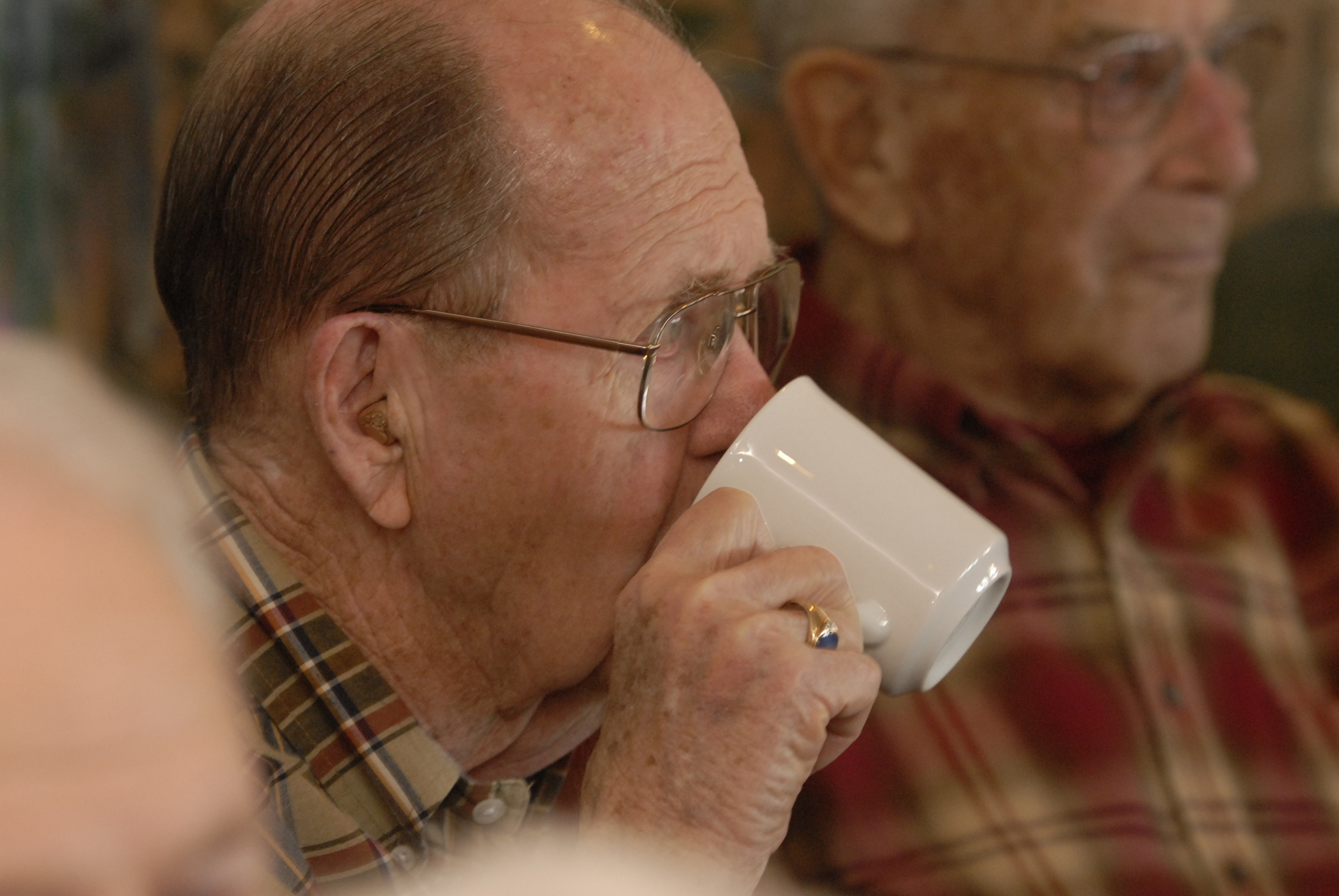 Jack Starkey enjoys a cup of coffee during a recent gathering of the J.O.Y. coffee group. The group members range in age from 70 to their mid-90s.