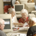 Surrounded by other tax aides and clients, Connie Young, an AARP tax-aide volunteer, center left, assists Dorothy Roper, Lawrence, in filling our her tax return Tuesday at the Lawrence Senior Center, 745 Vt. Low-income workers, retirees and senior citizens need to file a tax return to get the government's stimulus payment. Many haven't had to file in years but will want to this year to receive the money. The free AARP tax-aide service is offered at the senior center 1 p.m. to 4 p.m. Monday through Thursday, and 9 a.m. to noon Saturday through April 15.