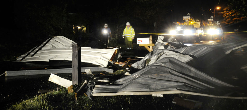 Many trees and buildings were damaged during the storm, including a mobile home in North Lawrence that was hit by a falling tree and Langston Hughes Elementary School, where about one-third of the gymnasium roof blew off. In addition, a tin roof blew off a Whelan’s Lumber storage building at 1516 W. Sixth St. and remains on the road on Florida Street.