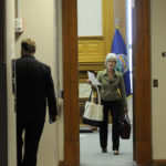 Gov. Kathleen Sebelius leaves her office with a security officer Tuesday at the Kansas Statehouse. She was confirmed as Secretary of Health and Human Services and will likely resign her post as governor.