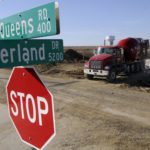 A Penny's Concrete truck approaches the intersection of Queens Road and Overland Drive on Friday. People living just to the east of Queens will be facing new fees as the area west of Queens is developed. Currently an unpaved street, Queens Road will also be paved with the new development. Pictured in the distance at right is the new city water tower near St. Margaret's Episcopal Church, 5700 W. 6th St.