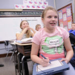 Maggie Wiseman, a sixth-grader at Woodlawn Elementary school, center, uses an Interwrite Tablet to complete a prime factorization exercise while projected on a screen at the front of her class Tuesday, Jan. 6, 2008. Both Republican and Democratic lawmakers said Tuesday that budget cuts to public schools and higher education were possible as the state faces an estimated billion budget shortfall. At left is Woodlawn sixth-grade teacher Haley Bruns.