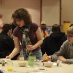 Free State High School students Kelsey Cherland, 17, a senior, center, and Keil Eggers, a junior, participate with other volunteers at the First United Methodist Church, 946 Vt. They helped serve a hot breakfast to those in need at 7:30 a.m. Friday at the Jubilee Café.