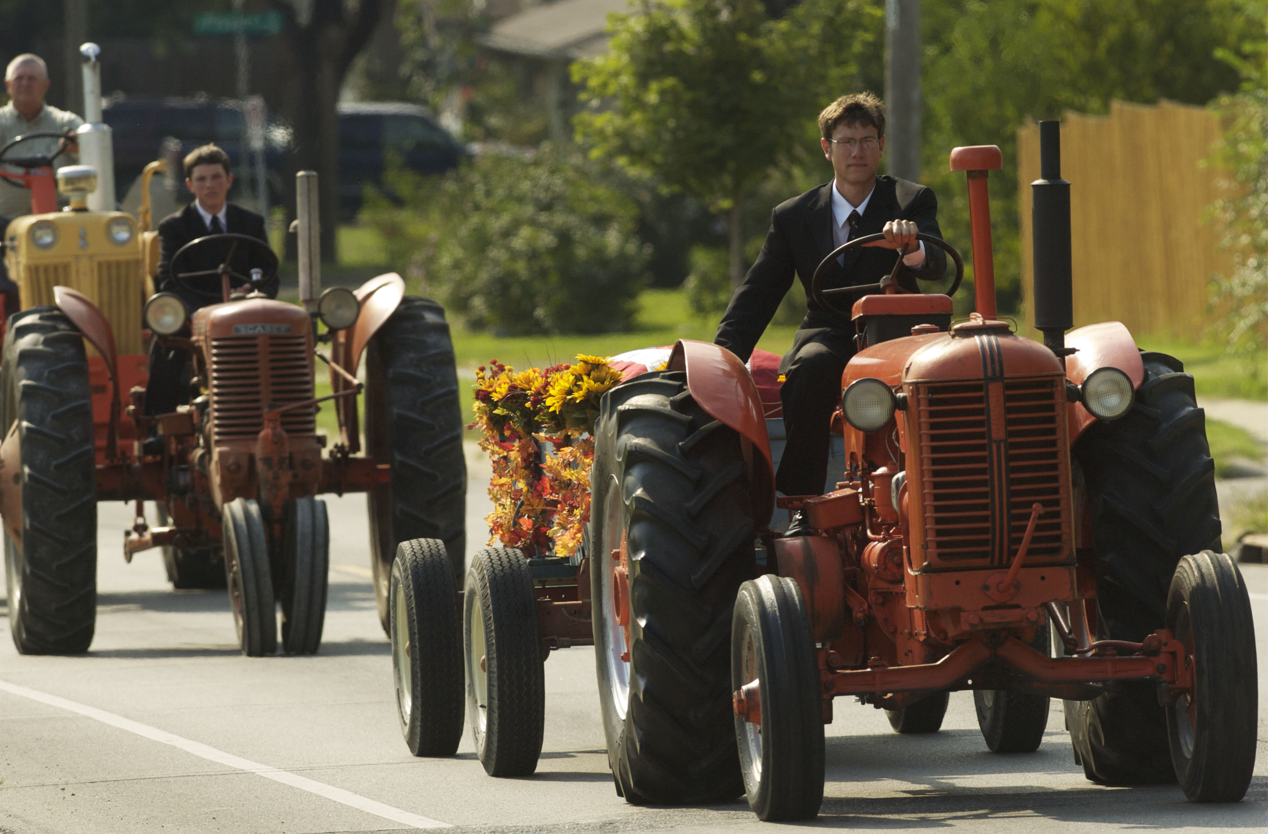 Procession of antique farm vehicles escorts ‘The Case Man’ to the cemetery