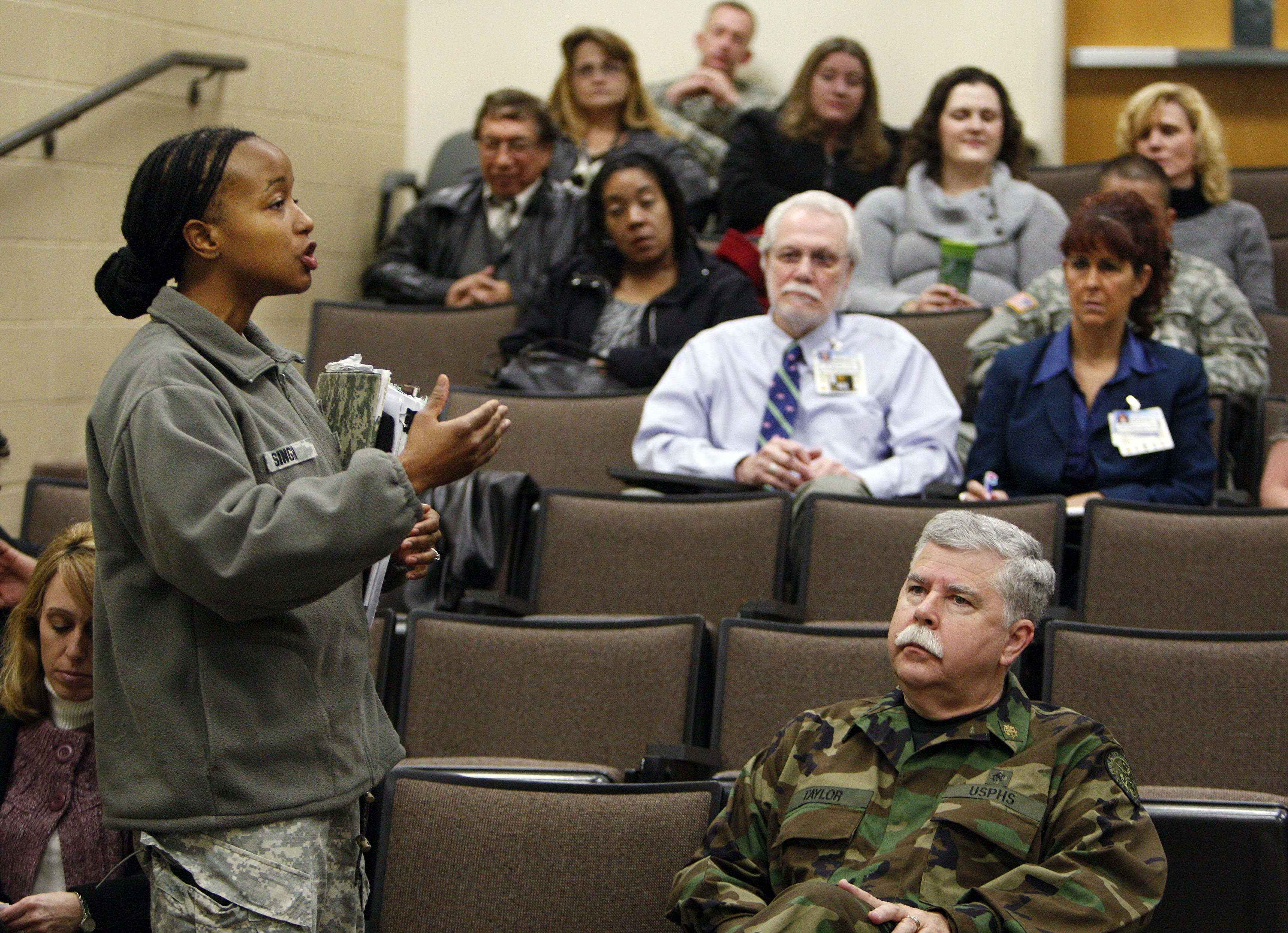 Dr. Tangeneare Singh, left, a psychiatrist at Fort Campbell Army base, speaks to counselors at a seminar on suicide prevention in Fort Campbell, Ky., in this Jan. 21 file photo. The fort is trying to reach out to soldiers who may be struggling with mental illnesses and change the traditional military mindset to show no weakness.