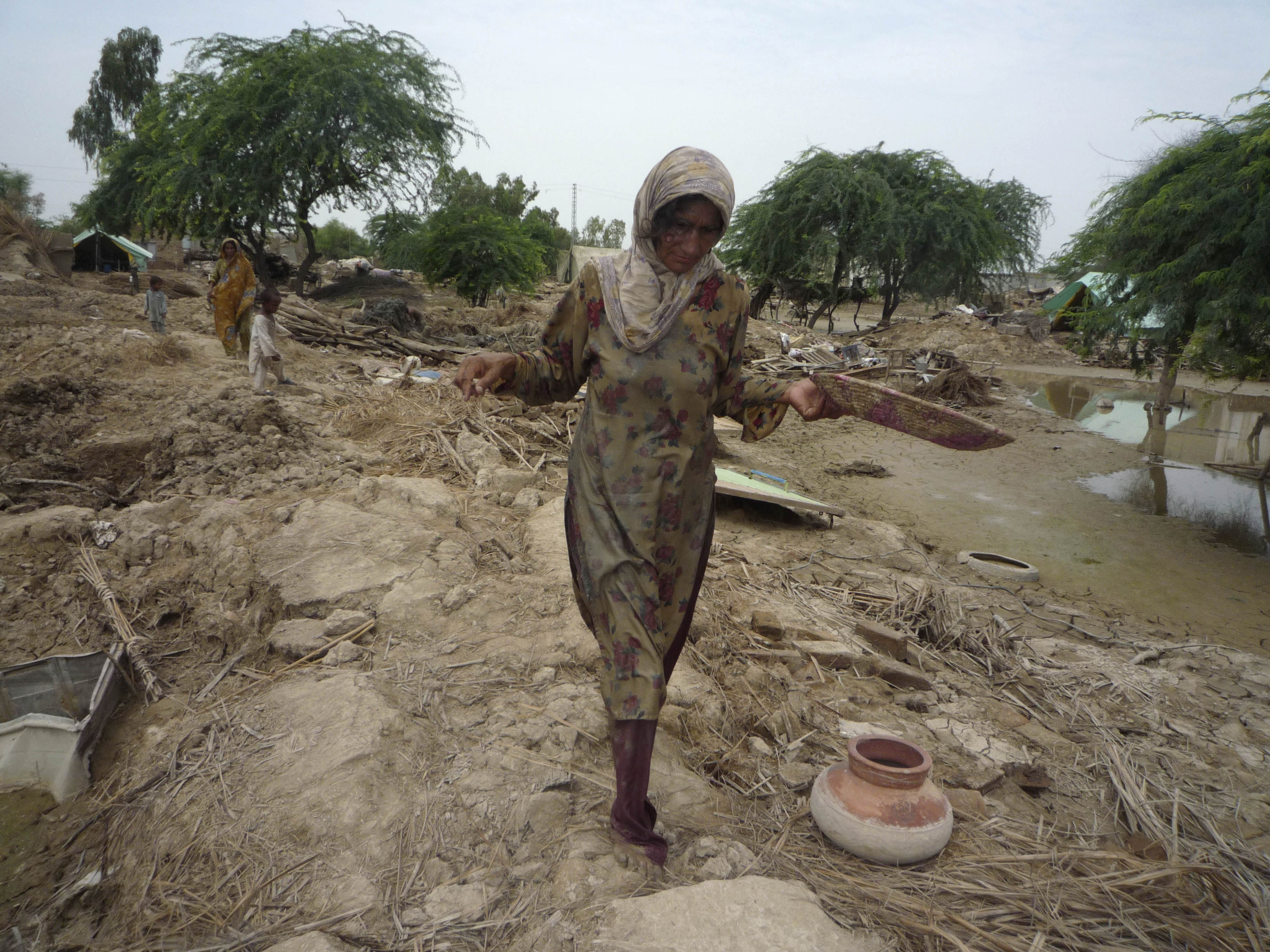 Pakistani flood survivors return to their village devastated by heavy floods Monday in Dera Ismail Khan, Pakistan. A forecast of more flooding has increased the urgency of the massive international relief effort.