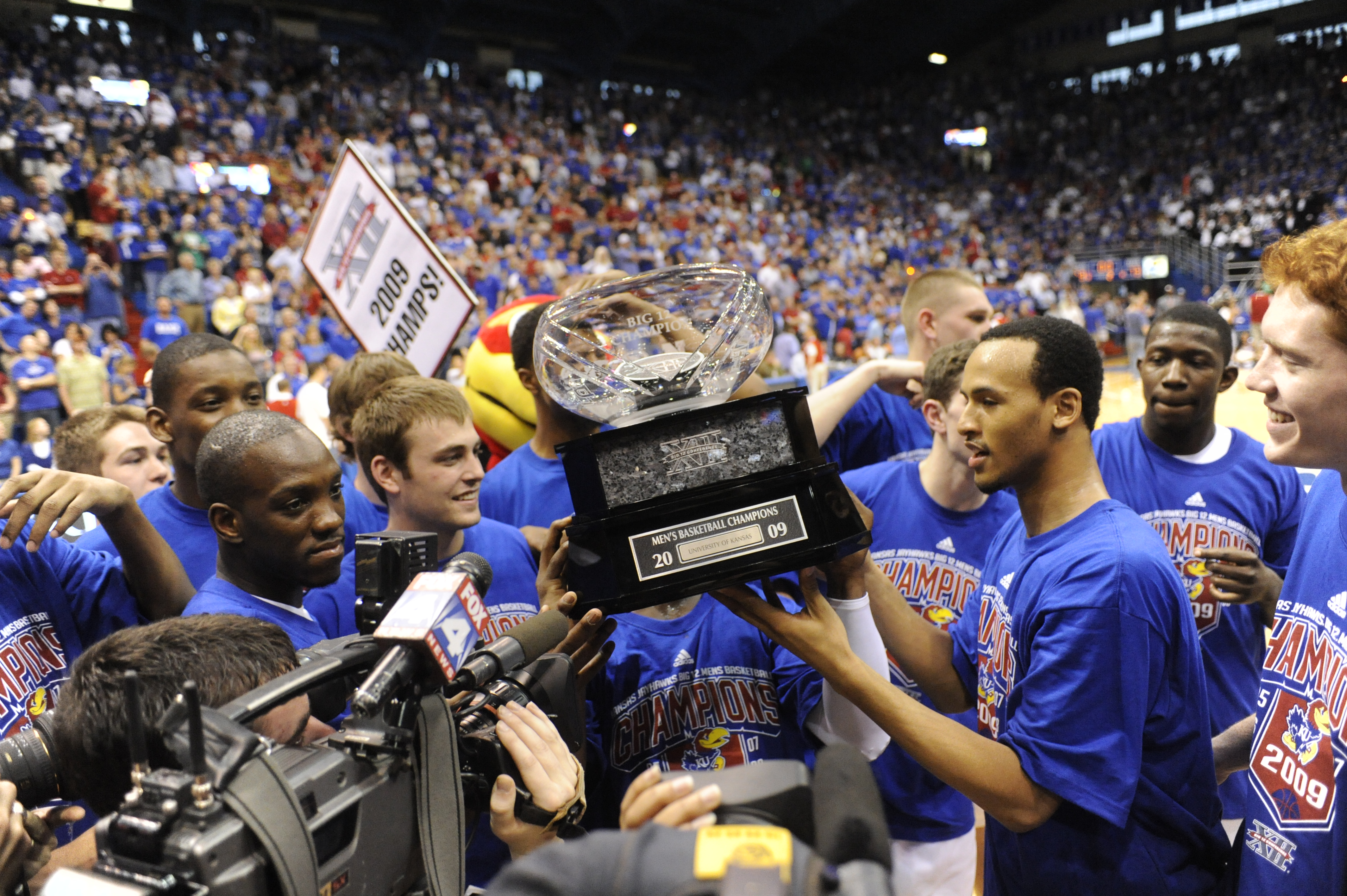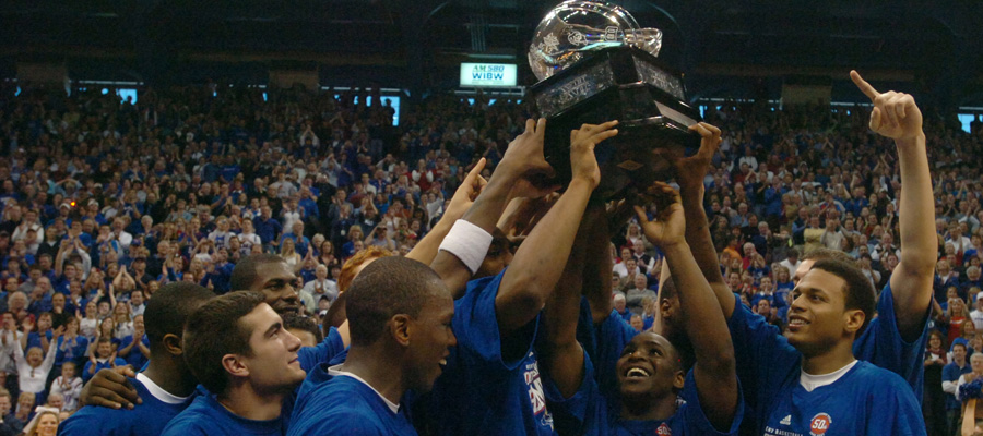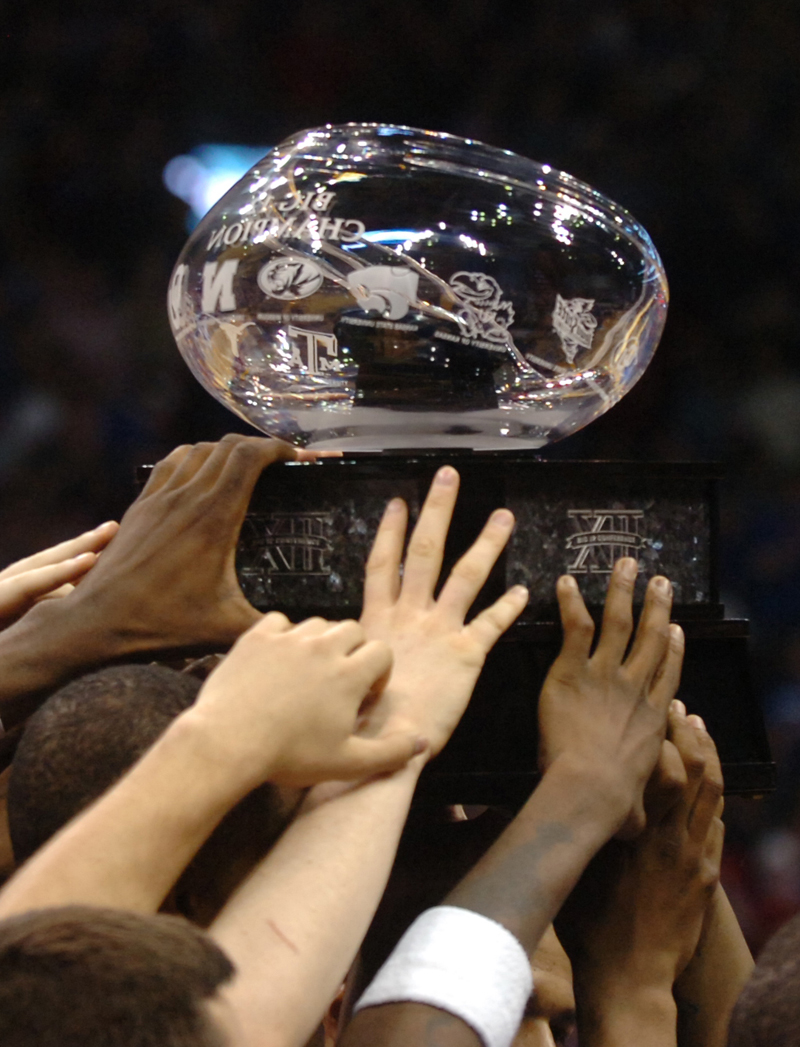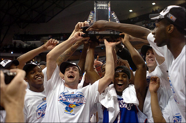 Kansas University basketball players hoist their newly-earned Big 12 regular season title trophy. The Jayhawks defeated Texas in March 2007 to take the regular season title outright and notch the program's 1,900th victory.